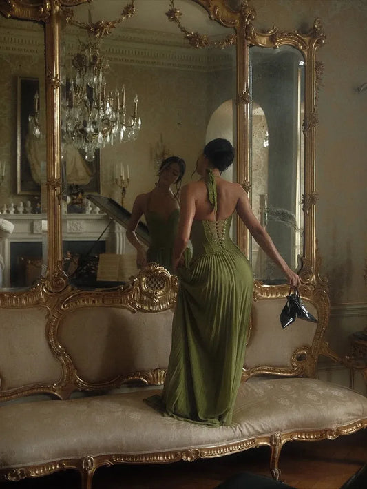 Elegant A-Line Halter-Neck Sleeveless Lace-Up-Back Maxi Evening Dress