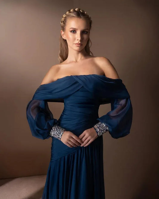Elegant A-Line Off-The-Shoulder Long-Sleeve Open-Back Beaded Maxi Evening Dress