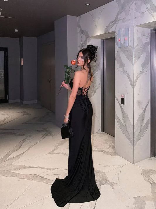 Glamorous Mermaid Strapless Sleeveless Lace-Up-Back Slit Maxi Evening Dress