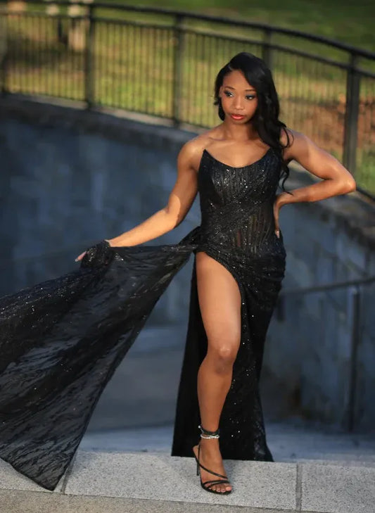 Sparkly Mermaid Spaghetti Straps Sleeveless Lace Up Floor-Length Prom Dress