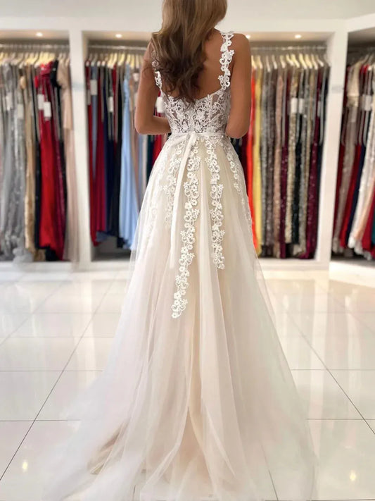 Graceful V Neck Sleeveless A-Line Tulle Appliques Floor-Length Prom Dress