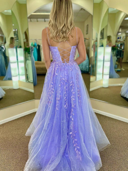 Romantic A-Line Spaghetti Strap Lace Lavender Floor-Length Party Dress