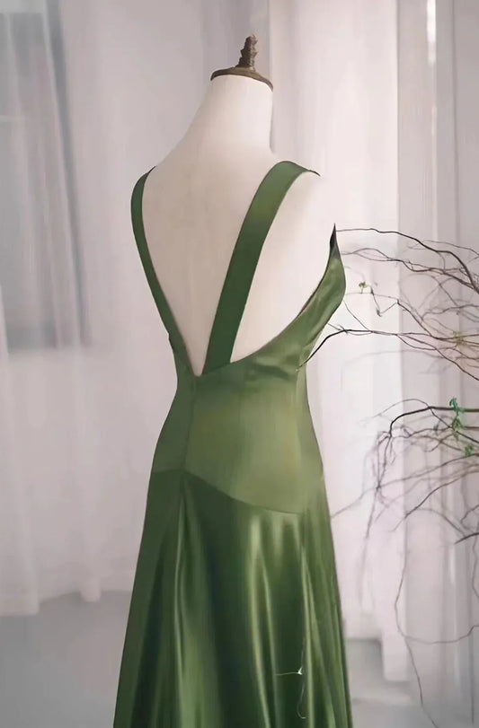 Simple V Neck Sleeveless Mermaid Pleated Satin Floor-Length Evening Dress