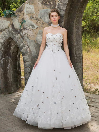 Ball Gown Wedding Dresses Sweetheart Neckline Floor Length Lace Tulle Sleeveless with Lace Appliques Flower