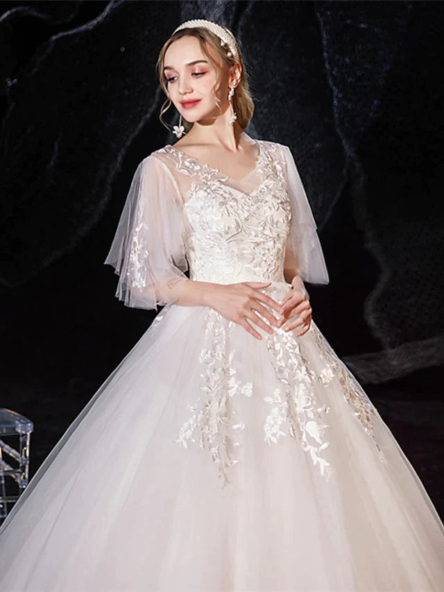 Princess Ball Gown Wedding Dresses V Neck Floor Length Lace Tulle Half Sleeve Formal Romantic with Appliques