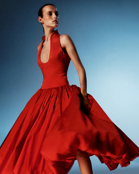 Elegant Halter Neck Satin Bubble Hem Midi Dress