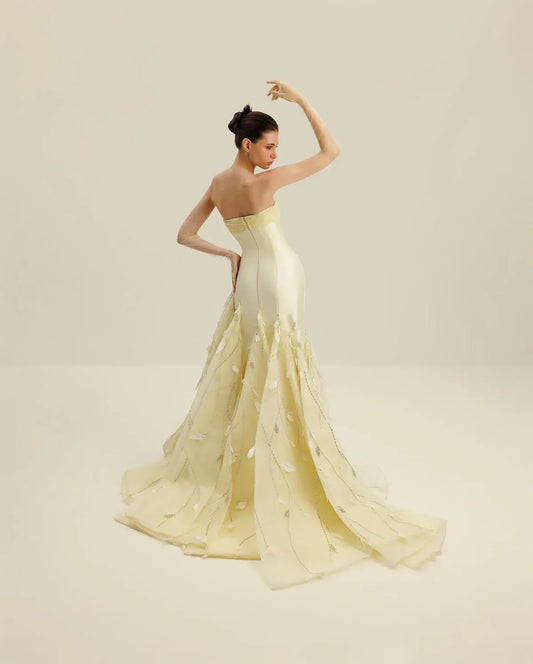 Elegant Mermaid Strapless Sleeveless Beaded Feather Leaf Appliqué Satin Evening Dress With Train