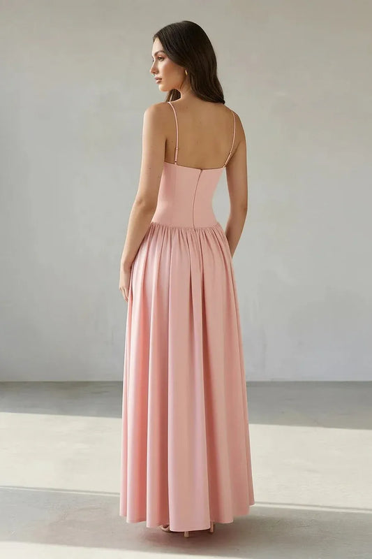 Elegant Spaghetti Strap Ruched Bodice Pleated Maxi Dress