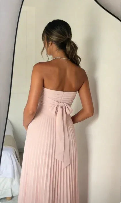 Elegant Strapless Bow Detail Pleated Chiffon Maxi Dress