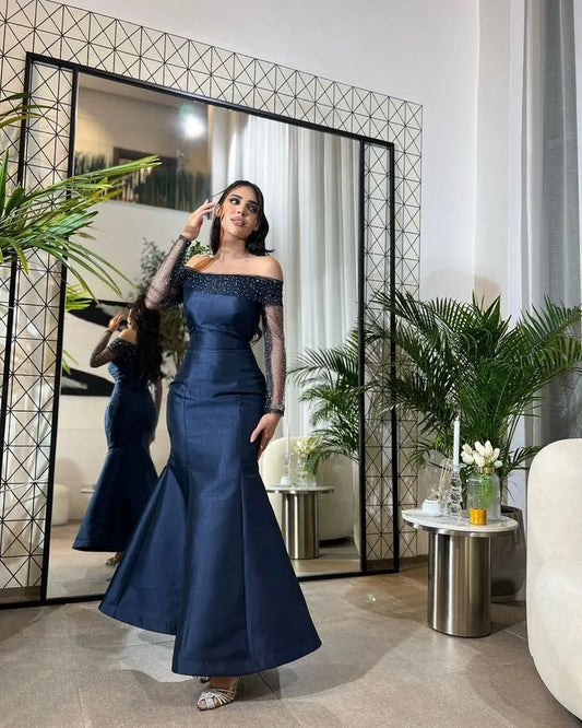 Elegant Mermaid Off the Shoulder Long Sleeve Sequins Satin Ankle-Length Prom Dress