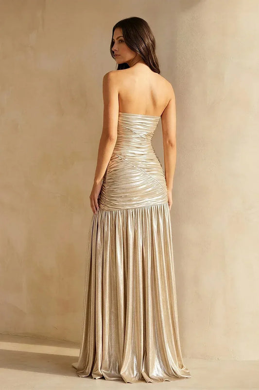 Glamorous Strapless Ruched Metallic Split Maxi Dress