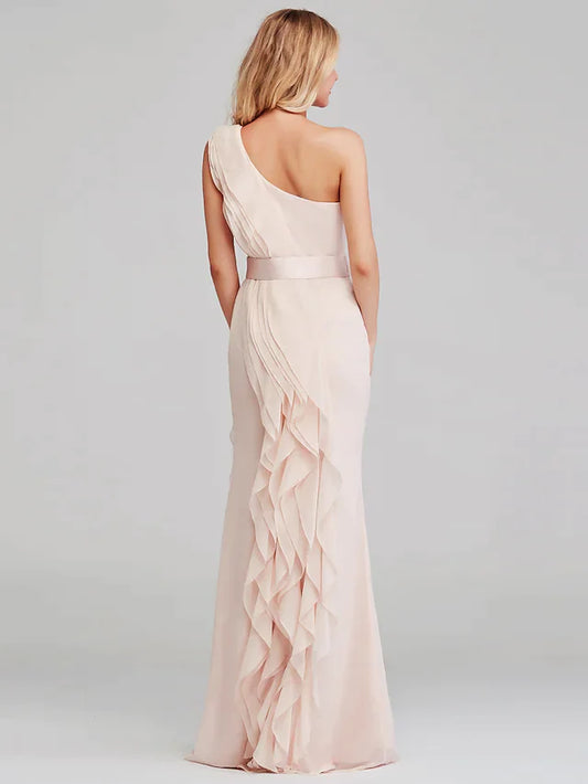 A-Line Princess Chiffon Ruffles One-Shoulder Sleeveless Asymmetrical Bridesmaid Dresses