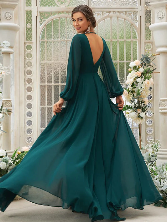A-Line Princess Chiffon Ruffles V-neck Long Sleeves Bridesmaid Dresses