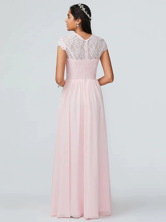 A-Line Princess Chiffon Applique Scoop Short Sleeves Floor-Length Bridesmaid Dresses