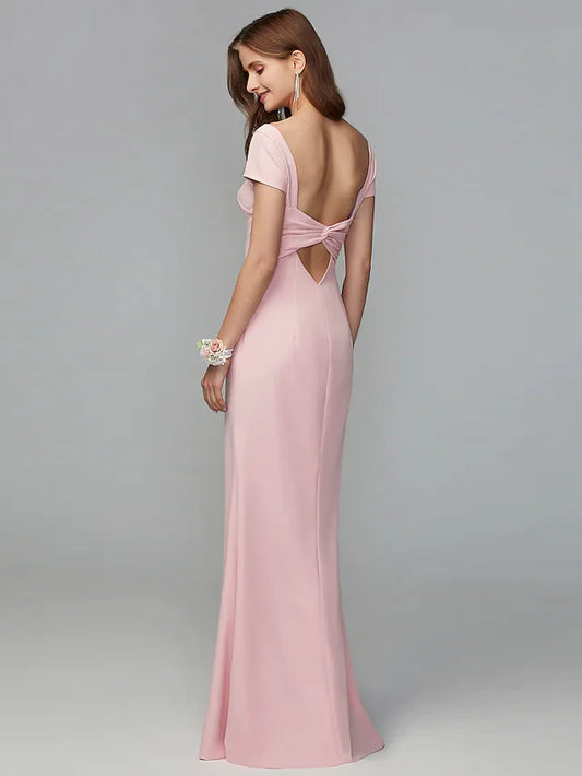 Scoop Neck Floor Length Jersey Bridesmaid Dress with Criss Cross Draping Open Back