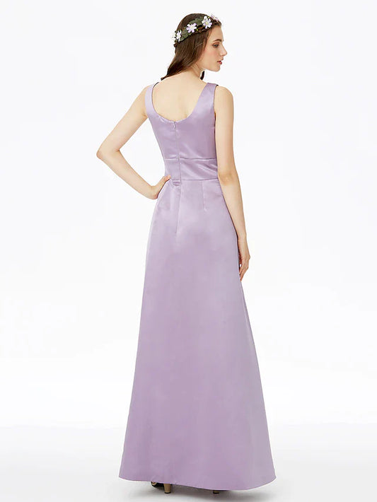A-Line Bridesmaid Dress Notched Sleeveless Elegant Floor Length Satin with Pleats / Pocket