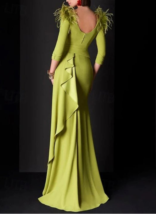 Mermaid / Trumpet Evening Gown Formal Fall Floor Length 3/4 Length Sleeve V Neck Satin with Feather Ruched Ruffles