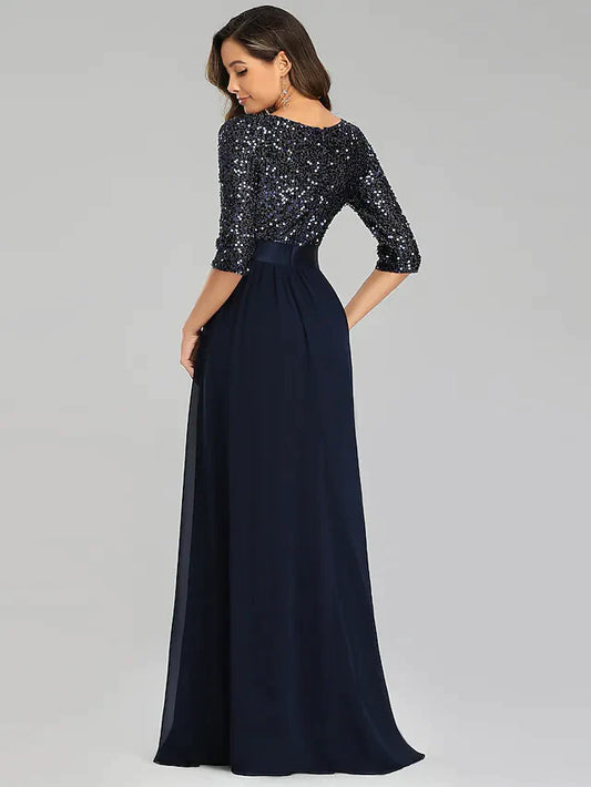 A-Line Elegant Wedding Guest Formal Evening Dress Jewel Neck 3/4 Length Sleeve Floor Length Tulle Sequined with Sequin