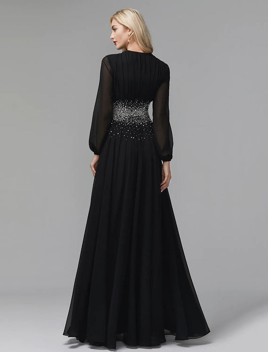 A-Line Evening Dress Celebrity Red Carpet Formal Gown Black Tie Wedding Guest Floor Length Long Sleeve V Neck Chiffon with Sequin