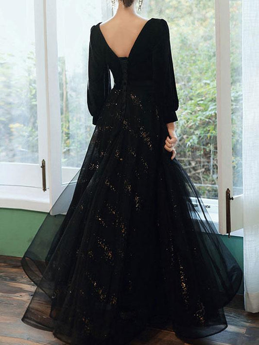 A-Line V-Neck Velvet Floor-Length Long Sleeves Lace-up Lace Formal Evening Dresses
