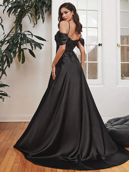 A-Line Square Neck With Train Sleeveless Backless Split Front Satin Formal Evening Dresses With Sweep Train