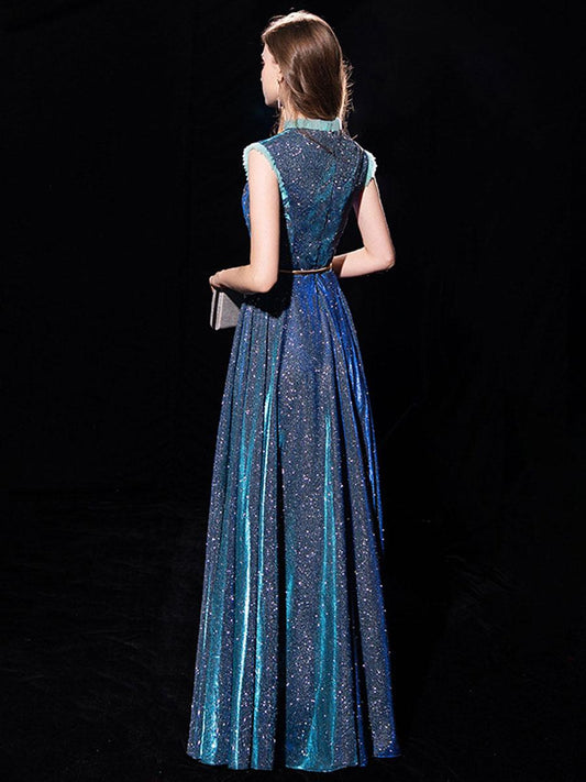 A-Line V-Neck Floor-Length Half Sleeves Sequined Evening Dresses