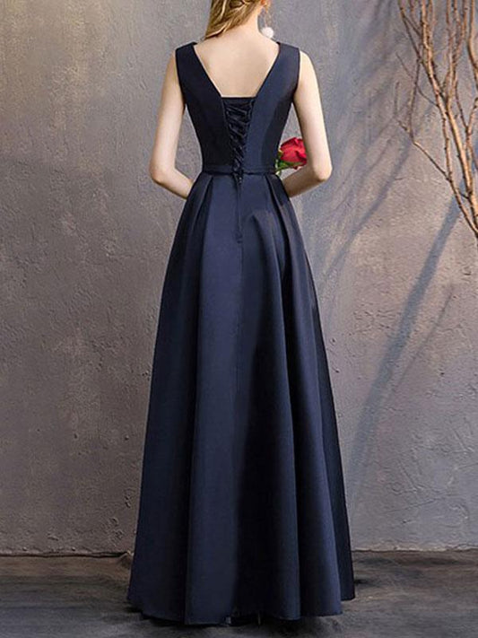A-Line V-Neck Satin Sleeveless Floor Length Pleated Dresses Evening Dresses Wedding Guest Dresses