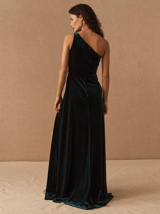 A-Line One-Shoulder Velvet Floor-Length Split Front Formal Evening Dresses Wedding Guest Dresses