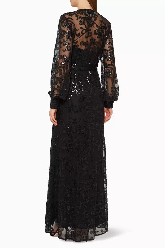 A-Line V-Neck Sequined Sash Evening Dresses Long Sleeves Floor-length Wedding Guest Party Dresses
