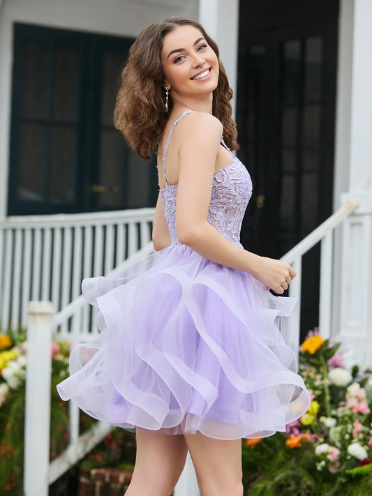Cute A-Line Appliqued Corset Top Short Tulle Dress Lilac Homecoming Dress