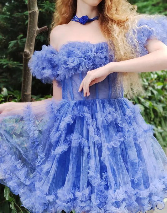Blue A Line Off the Shoulder Tulle Corset Homecoming Dress