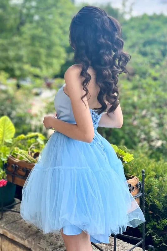 A-Line Princess Tulle Light Blue Strapless Homecoming Dress
