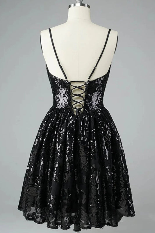 Black Spaghetti Straps V Neck Sequins Short Homecoming Dresses