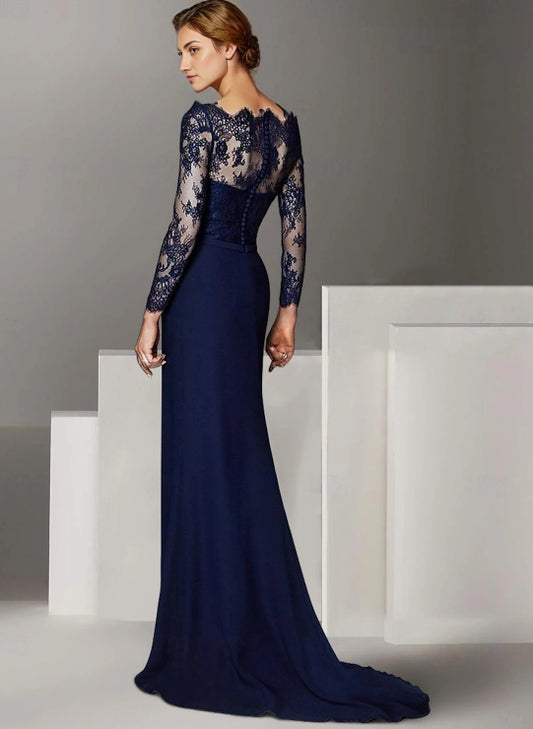 Mermaid Mother of the Bride Wedding Guest Dress Off-the-Shoulder Floor Length Chiffon Stretch Lace Long Sleeve with Ruched