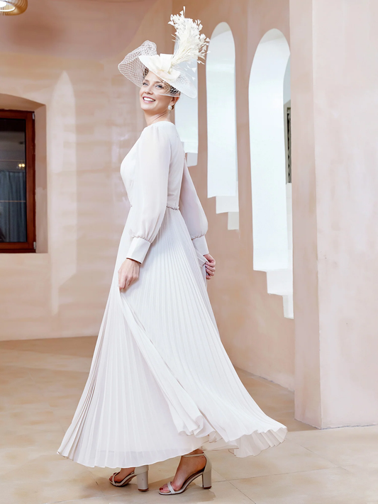V-neck Long Sleeves Pleated Ruched Dress Ivory Floor-length Chiffon Mother of the Bride Dresse