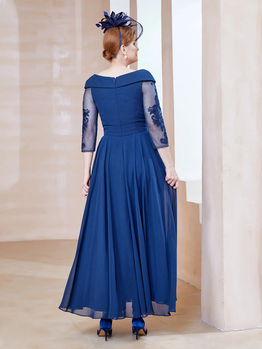 34-Length Sleeves V-neck Pleated Long Dress Dark Navy Mother of the Bride Dresse