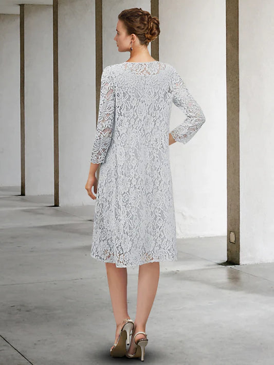 Mother of the Bride Dress Elegant Jewel Neck Knee Length Lace Satin Length Sleeve with Appliques