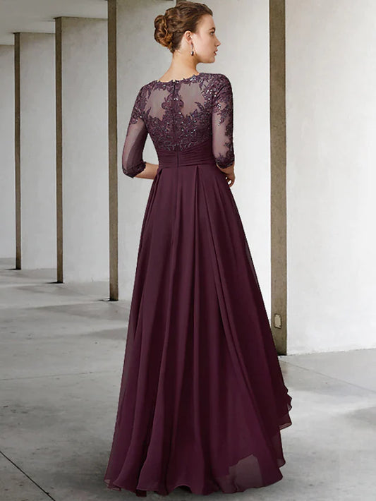 Mother of the Bride Dress Elegant Jewel Neck Floor Length Chiffon Lace Half Sleeve with Pleats Appliques