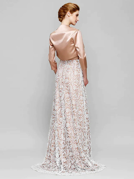 A-Line Mother of the Bride Dress Elegant V Neck Floor Length Chiffon Lace Half Sleeve with Sash Ribbon Appliques