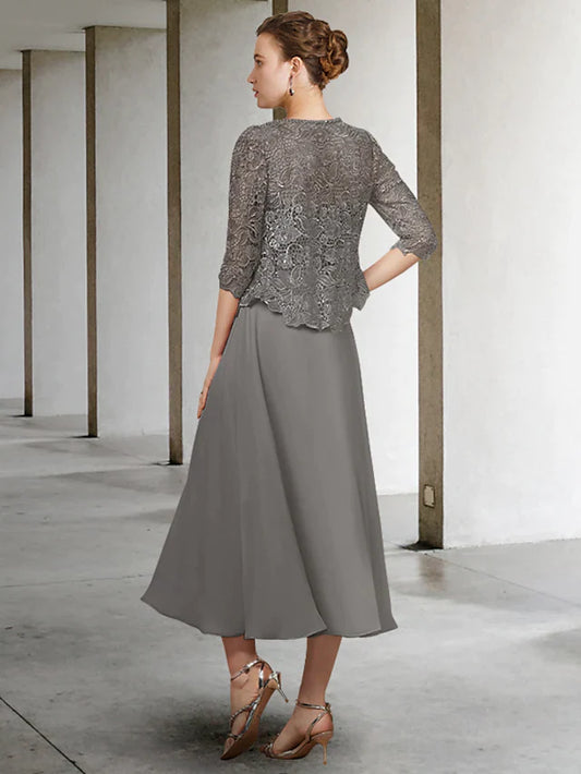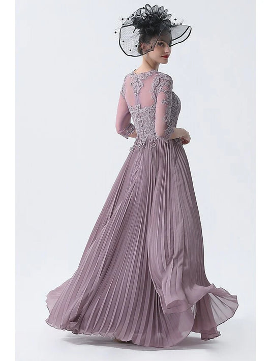 Two Piece A-Line Mother of the Bride Dress Elegant Scoop Neck Floor Length Chiffon Lace Half Sleeve with Pleats Appliques