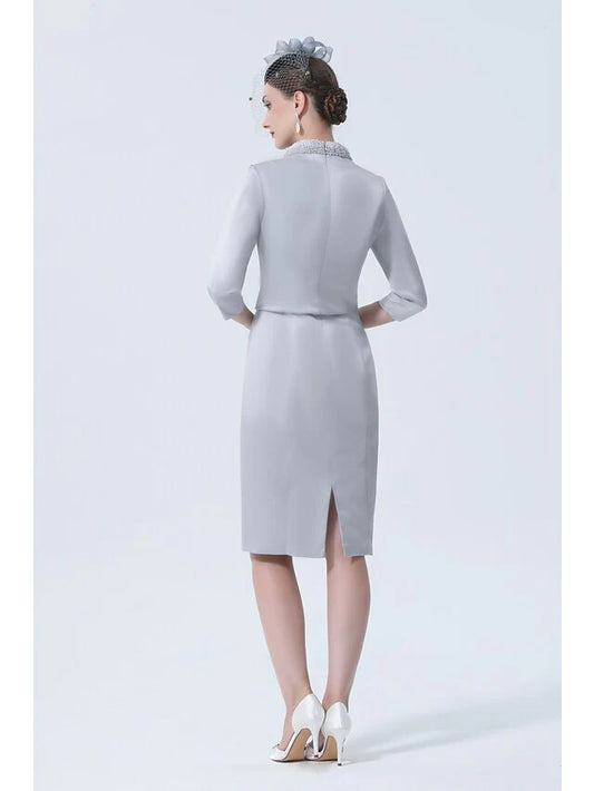Mother of the Bride Dress Plus Size Elegant Vintage High Neck Knee Length Satin 3/4 Length Sleeve with Crystals Appliques
