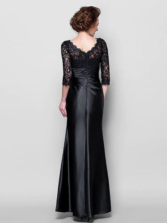 Mother of the Bride Dress Elegant Square Neck Ankle Length Satin Length Sleeve with Lace Ruched