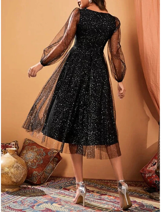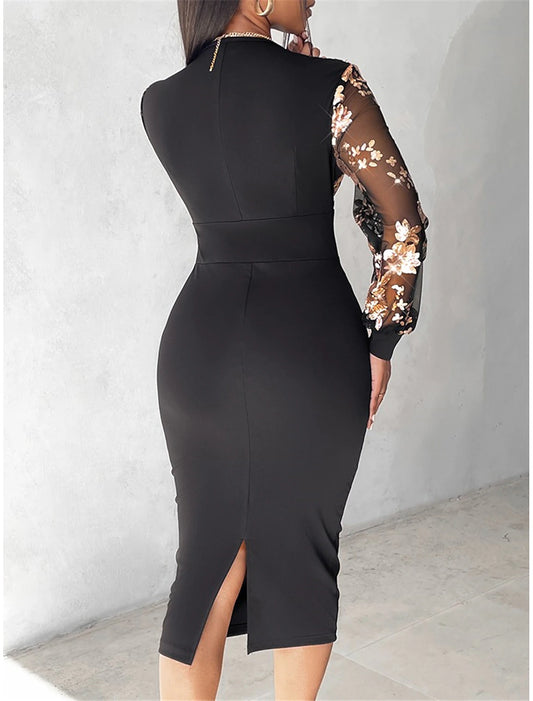 Party Dress Cocktail Dress Mesh Mesh Patchwork V Neck Long Sleeve Midi Dress