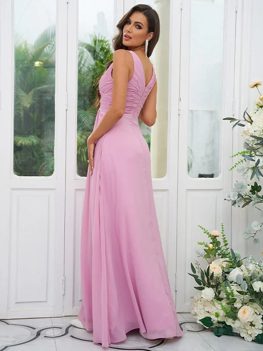 A-Line Princess Chiffon Ruffles V-neck Sleeveless Floor-Length Bridesmaid Dresses