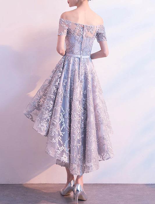 A-Line Cocktail Dresses Elegant Dress Homecoming Asymmetrical Short Sleeve Off Shoulder Tulle with Bow(s) Pleats