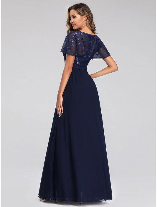 A-Line Wedding Guest Dresses Fall Floor Length Short Sleeve V Neck Bridesmaid Dress Tulle with Sequin Applique
