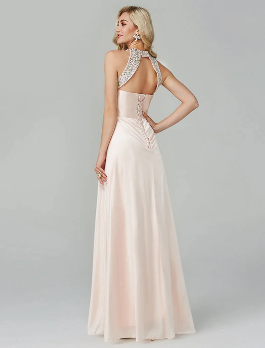 A-Line Little Black Dress Dress Party Wear Wedding Guest Floor Length Sleeveless Halter Neck Silk Backless with Crystals Sequin
