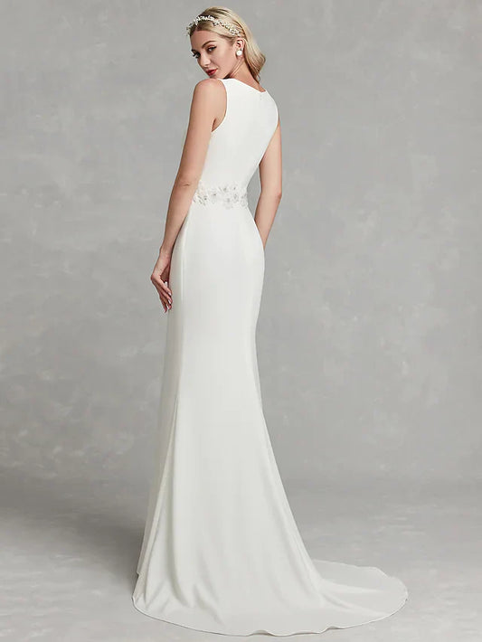 White Plus Size Deep V-Neck Sleeveless High Slid Simple Wedding Dress With Slit