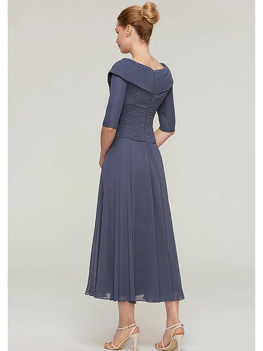 A-Line Mother of the Bride Dress Plus Size Elegant V Neck Tea Length Chiffon 3/4 Length Sleeve with Pleats Ruched