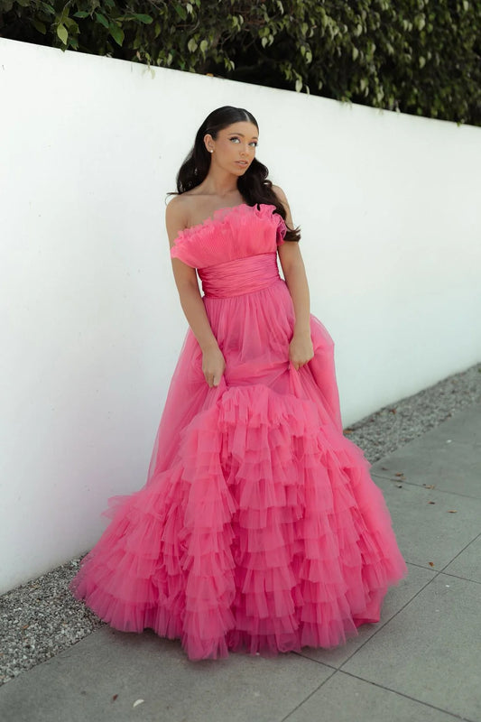 Formal Wear Dresses Strapless Pink Tulle Emprie Ruffles A-line Gown Prom Dress Stores With Prom Dresses